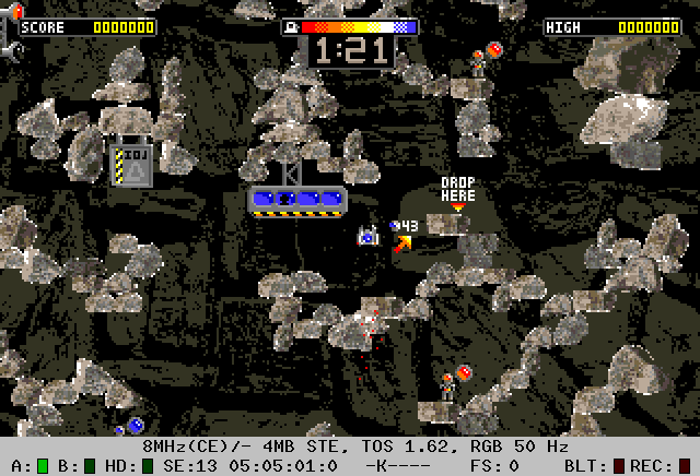 Each level is larger than a screen and offers parallax scrolling. Chicane is no stranger to Atari fans and has made a name for himself with the new arcade conversion of Pole Position (2017) and, in particular, the lightning-fast STE racer FASTER (2024). This is also evident in Cavey Taxi: full-screen parallax scrolling and a particle system. The game is being developed exclusively for the STE and requires 1 MB of RAM.